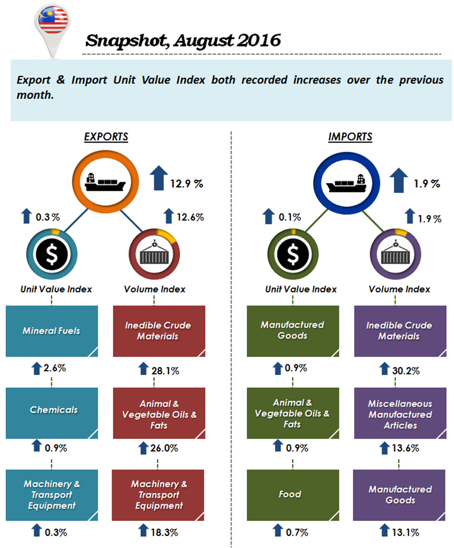 In August 2016, the import unit value index registered a marginal increase of 0.1% to 108.5 points which was attributed to manufactured goods (+0.9%), animal & vegetable oils & fats (+0.9%) and food (+0.7%). Meanwhile, the import volume index increased 1.9% to 123.7 points. This increase was led by inedible crude materials (+30.2%) followed by miscellaneous manufactured articles (+13.6%) and manufactured goods (+13.1%). In seasonally adjusted terms, the import volume index expanded 5.9%.