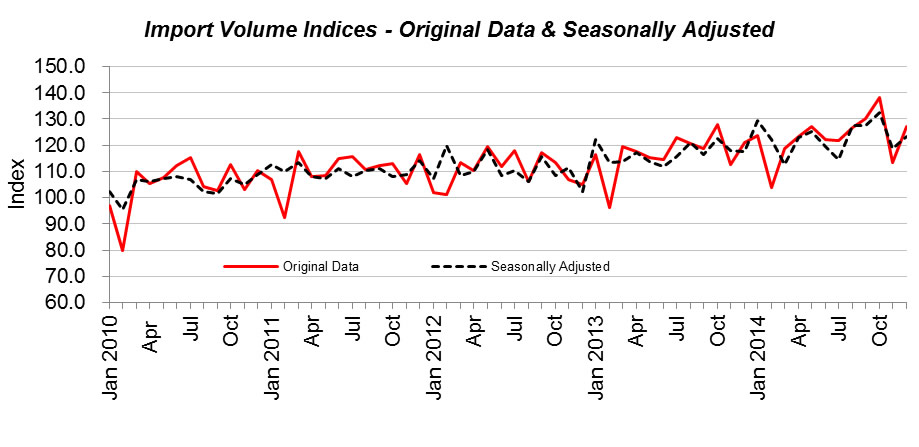 In seasonally adjusted terms, the import volume index decreased 4.0% to 123.5 points.