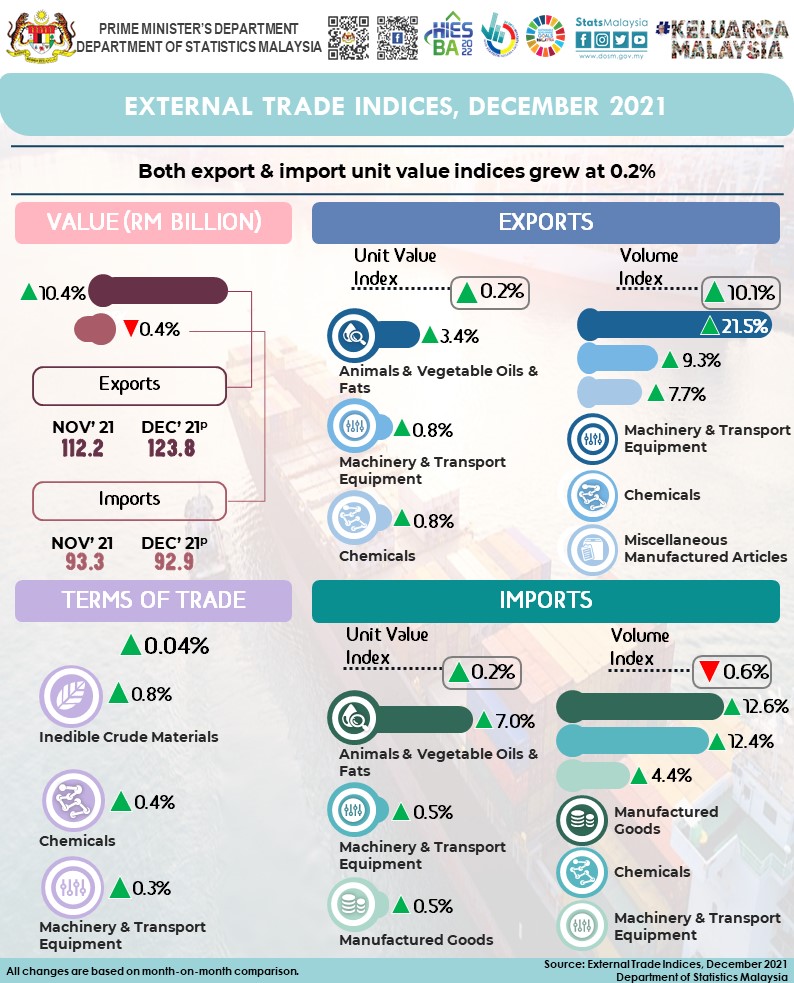 The full publication of the External Trade Indices, December 2021 can be downloaded through eStatistik Portal.