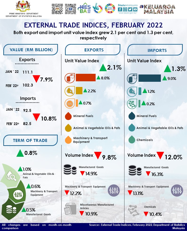 The full publication of the External Trade Indices, February 2022 can be downloaded through eStatistik Portal.