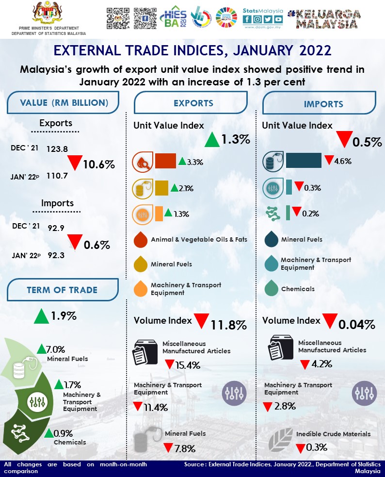 The full publication of the External Trade Indices, January 2022 can be downloaded through eStatistik Portal.