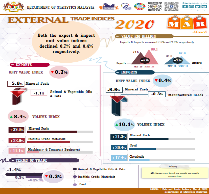 In March 2020, the import unit value index recorded a decline of 0.4% to 116.2 points which was due to the decrease in the index of mineral fuels (-6.6%) and manufactured goods (-0.3%). While, the import volume index rose 10.1% to 132.6 points. This was contributed by the increase in the index of mineral fuels (+31.5%), food (+20.4%) and chemicals (+17.4%). In seasonally adjusted terms, the import volume index in March 2020 dropped 1.4% to 134.8 points.