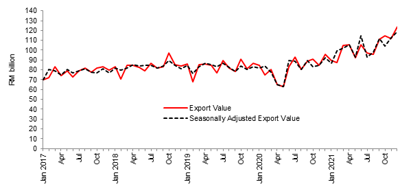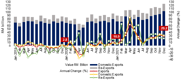 Malaysia’s exports reached a new high, RM123.8 billion in December 2021, expanded by 29.2 per cent as compared to the previous year. The expansion was driven by both domestic exports and re-exports. Domestic exports stood at RM102.7 billion and contributed 83.0 per cent to total exports, grew by 30.7 per cent. On the same note, re-exports with a value of RM21.1 billion, grew by 22.3 per cent y-o-y. In comparison to November 2021, exports rose 10.4 per cent or RM11.6 billion. Analysis of the seasonally adjusted terms m-o-m, exports increased by 5.9 per cent or RM6.7 billion to RM119.0 billion.
