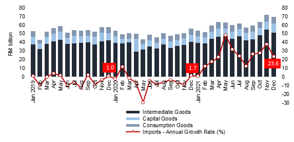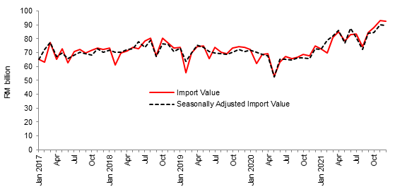 Malaysia’s imports in December 2021 totalled RM92.9 billion, continued to register a growth of 23.6 per cent or RM17.7 billion. On a m-o-m basis, imports decreased marginally by 0.4 per cent or RM403.3 million. Based on seasonally adjusted terms, imports dropped 0.8 per cent to RM89.7 billion.