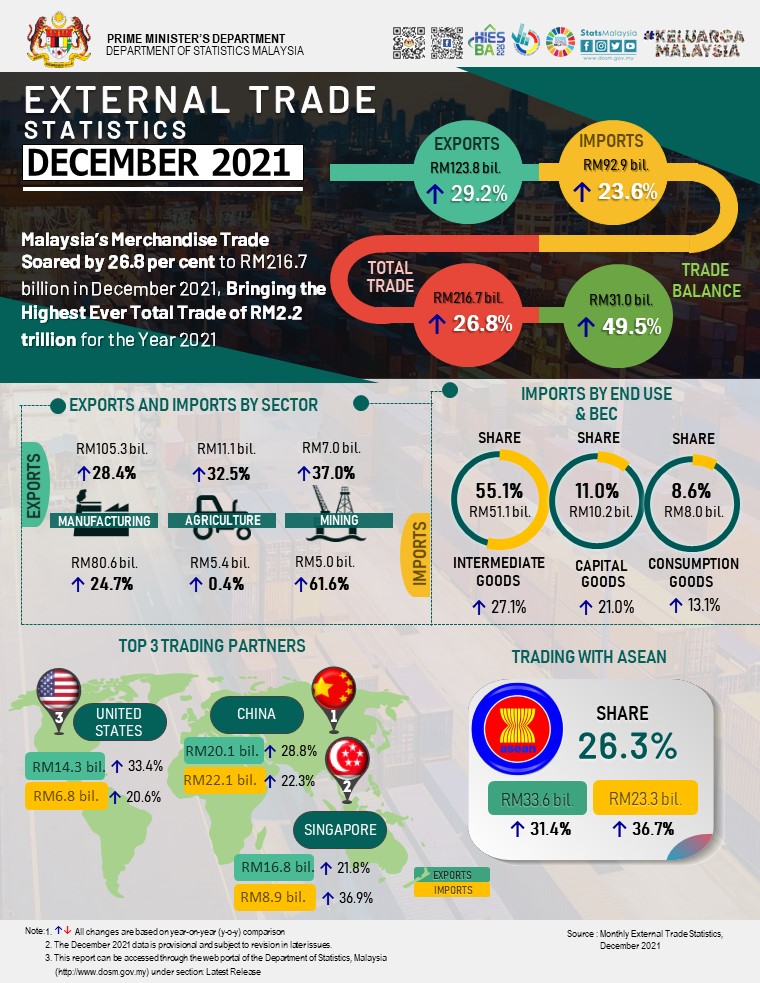 Malaysia’s total trade in December 2021 surged by 26.8 per cent, reaching RM216.7 billion as compared to RM171.0 billion in the previous year. Exports continued to increase with double-digit growth of 29.2 per cent to RM123.8 billion as compared to December 2020. Imports rose by 23.6 per cent year-on-year (y-o-y) in December 2021 amounted at RM92.9 billion. Trade value continued to record a surplus, with a value of RM31.0 billion, an increase of 49.5 per cent from the previous year. On a month-on-month (m-o-m) basis, exports, total trade and trade surplus recorded positive growths of 10.4 per cent, 5.5 per cent and 63.6 per cent, respectively. However, imports decreased marginally by 0.4 per cent.