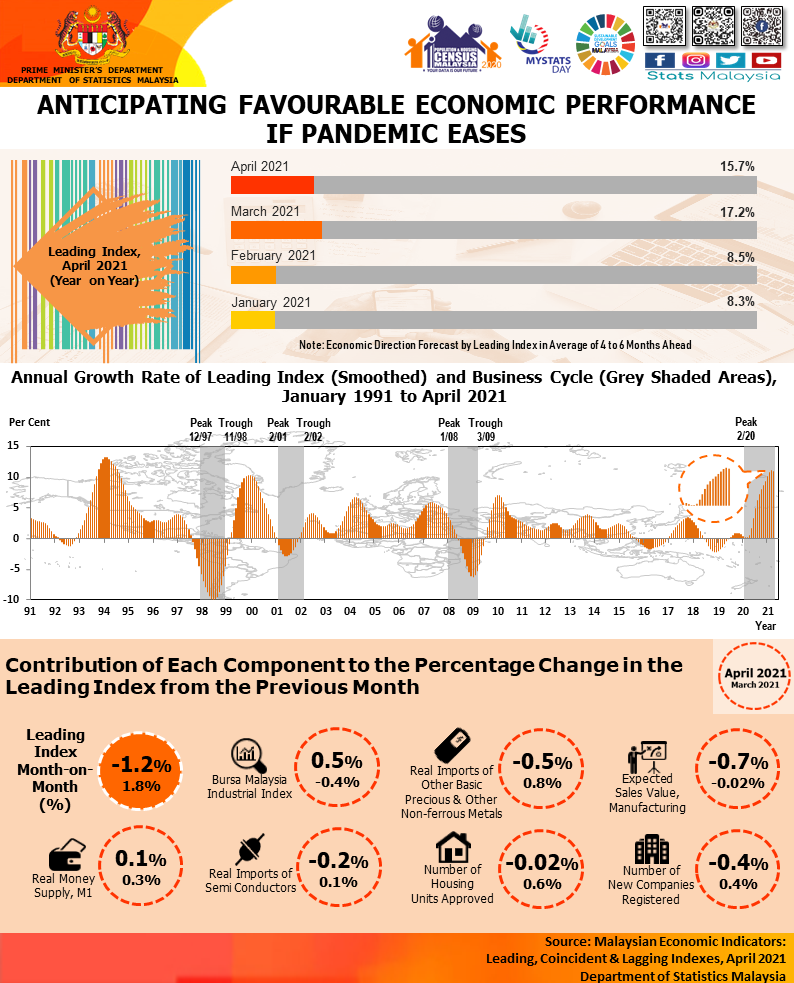In April 2021, Malaysia’s Leading Index (LI) remained to register a double-digit growth at 15.7 per cent to record an index of 111.8 points after a surge of 17.2 per cent in the previous month (March 2021: 113.2 points). The improvement was supported by positive contributions of all LI components and influenced primarily by the low base effect from the previous year (April 2020: 96.6 points). Meanwhile, the LI decreased by 1.2 per cent for month-on-month performance. The growth rate of smoothed LI which is used to predict the direction of economic movements in the near future remained positive. The LI anticipates favourable economic performance if pandemic eases. The short-term outlook is in line with the strengthening of global demand in which some countries have relaxed their economy besides the success of herd immunity and effective roll out of National Recovery Plan to accelerate the country's economic recovery.