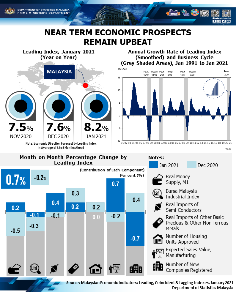 The full publication of the Malaysian Economic Indicators: Leading, Coincident & Lagging Indexes, January 2021 can be downloaded through eStatistik Portal.