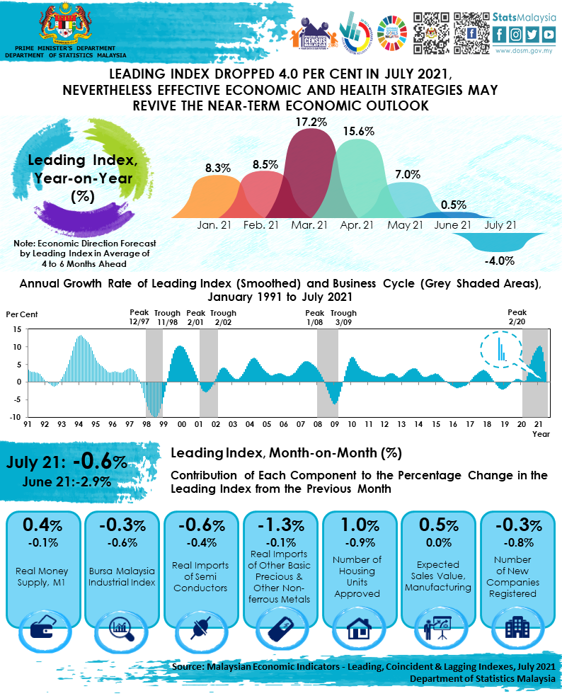 The prolonged disruptions in the economy continued to affect the performance of the Leading Index (LI) which showed a declining trend in July 2021. On an annual basis, the LI tumbled 4.0 per cent to record 105.0 points in July 2021 (July 2020: 109.4 points). The 4.4 points downward shift was mainly driven by the reduction in the Number of New Companies Registered, with a total of 2,646 newly registered local companies in July 2021 as against 5,522 companies in the same month of last year. Besides that, the decrease was also influenced by the base effect from the previous year. Concurrently, the LI also posted a month-on-month decrease in July 2021 at negative 0.6 per cent primarily caused by Real Imports of Other Basic Precious & Other Non-ferrous Metals (-1.3%). Considering a weaker performance of LI in the reference month and the declining trend of smoothed LI growth rate since March 2021, it is expected that the Malaysia’s economic outlook is likely to be surrounded by uncertainty. Nevertheless, the effectiveness of various economic and health strategies alongside the cooperation of the people in adopting the new normal and adhering to the Standard Operating Procedures (SOP) may revive the near-term economic prospect.