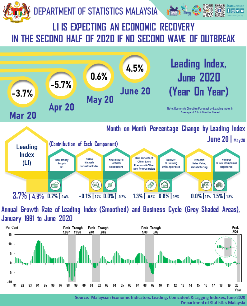The Leading Index (LI) is compiled to anticipate advance signal on economic direction in the near future. The LI grew at a faster pace to reach 4.5 per cent in June 2020 (May 2020: 0.6%) based on year-on-year comparison. Meanwhile, the LI recorded 3.7 per cent in June 2020 as against the previous month. The month-on-month growth of LI was contributed mainly by the Number of New Companies Registered (1.5%) and Real Imports of Other Basic Precious & Other Non-ferrous Metals (1.3%). The LI shows a better signal of economic direction as the economic sectors were allowed to resume operations while adhering new normal starting 10 June 2020 with the implementation of Recovery Movement Control Order (RMCO). Despite a deep contraction of Gross Domestic Products in the second quarter of 2020, the LI is expecting an economic recovery in the second half of 2020 in line with the open up of more economic activities and no second wave of outbreak in mind.