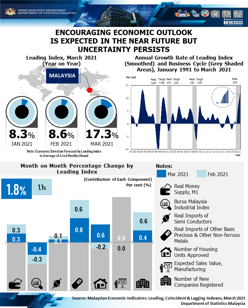 Malaysia’s Leading Index (LI) continued to trend up in March 2021 posted a double-digit growth, 17.3 per cent year-on-year to 113.3 points (March 2020: 96.6 points). This was the highest year-on-year growth recorded primarily as a result of the sharp drop in March 2020 following the earlier restrictions to curb the global pandemic and mainly influenced by the strong growth in Number of Housing Units Approved, Real Imports of Other Basic Precious & Other Non-ferrous Metals and Number of New Companies Registered. Looking into month-on-month perspective, the LI observed a similar trend by registering 1.8 per cent in March 2021 from 1.1 per cent in February 2021 attributed mainly by Real Imports of Other Basic Precious & Other Non-ferrous Metals (0.8%) and Number of Housing Units Approved (0.6%). In March 2021, the LI which indicates the ability in anticipating the economic direction in advance pointed a better economic prospects through the movement of growth rate of smoothed LI. Despite uncertainty persists, an encouraging economic outlook is expected in the near future. This is in line with the anticipated promising signs of Malaysia’s merchandise trade performance as well as positive sentiment in Manufacturing sector, Motor Vehicles sub-sector and commodity prices.