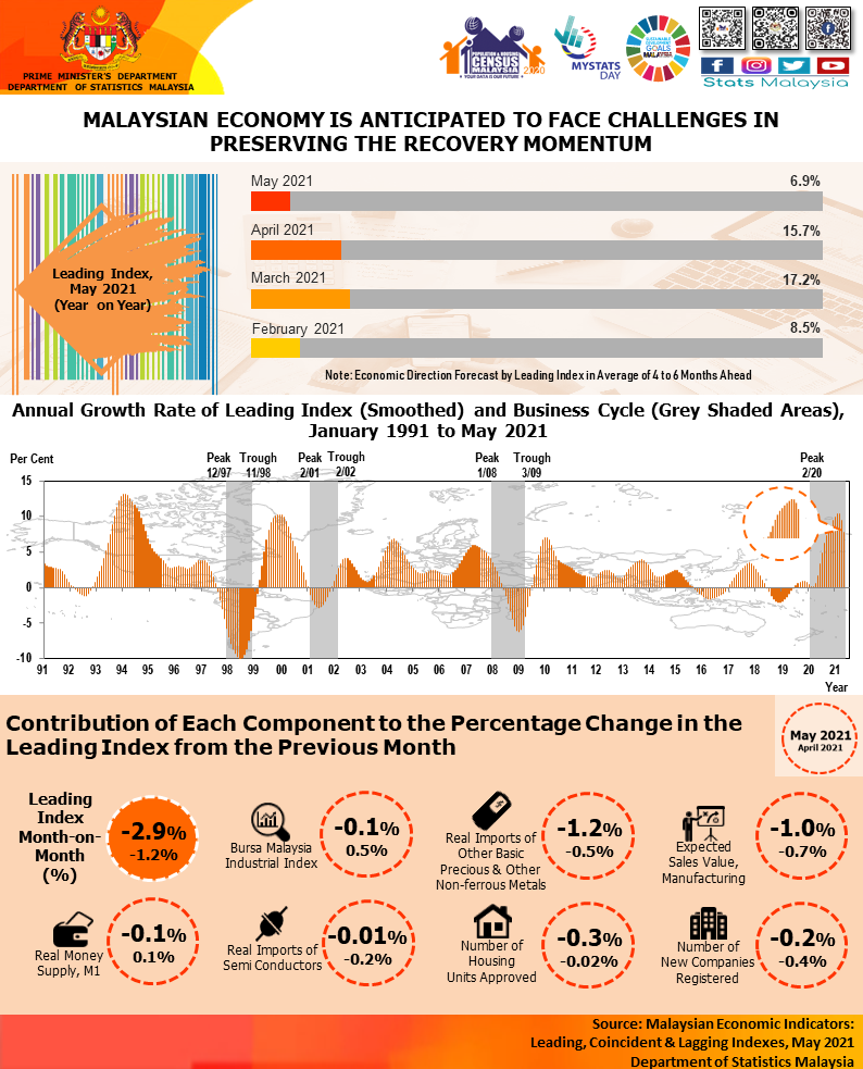 Malaysia’s Leading Index (LI) which acts as an indicator on the future movement of the overall economy eased to 6.9 per cent in May 2021 (April 2021: 15.7%) based on year-on-year comparison. The growth was driven by Real Imports of Other Basic Precious & Other Non-ferrous Metals and Number of Housing Units Approved. Concomitantly, the LI declined by 2.9 per cent month-on-month. Real Imports of Other Basic Precious & Other Non-ferrous Metals (-1.2%) particularly platinum was amongst the components that underpinned the decrease of LI. The growth rate of smoothed LI remained above trend, however moving downwards which the Malaysian economy is anticipated to face challenges in preserving the recovery momentum. The emergence of new lethal variant of the COVID-19 has triggered pessimistic sentiment at global and national frontiers. Further to this, prolong movement restrictions in safeguarding lives may affect the prospects of recovery.