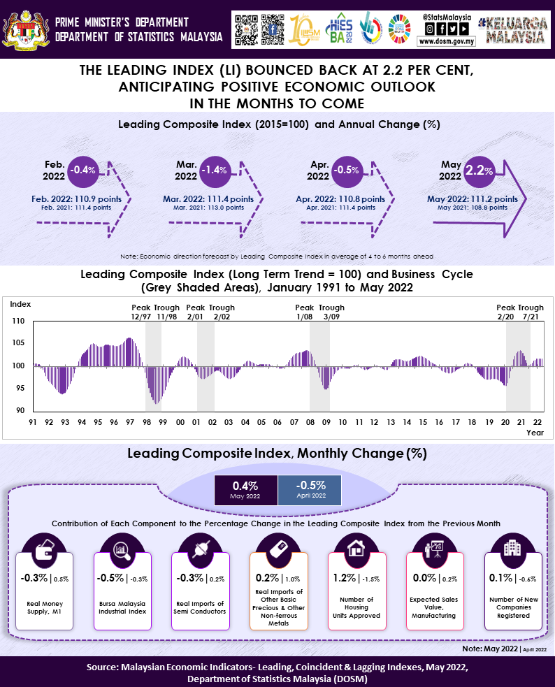 Leading Index (LI) bounced back to register a positive growth of 2.2 per cent to 111.2 points in May 2022 as compared to 108.8 points in the same month of the preceding year. The expansion of the LI was primarily backed by the increment in Real Imports of Other Basic Precious & Other Non-ferrous Metals driven by the encouraging demand in platinum-based imports. Correspondingly, the LI grew to 0.4 per cent based on monthly comparison. The growth was underpinned significantly by a good performance in the Number of Housing Units Approved (1.2%), Real Imports of Other Basic Precious & Other Non-ferrous Metals (0.2%) and Number of New Companies Registered (0.1%). Overall, LI showed a better performance in May 2022 with the long-term trend index continuously above 100.0 points, anticipating positive economic outlook in the months to come. Moving forward, efficient and effective inflation management by the government is crucial for sustainable economic growth.