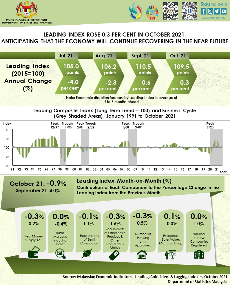 The full publication of the Malaysian Economic Indicators: Leading, Coincident & Lagging Indexes, October 2021 can be downloaded through eStatistik Portal.