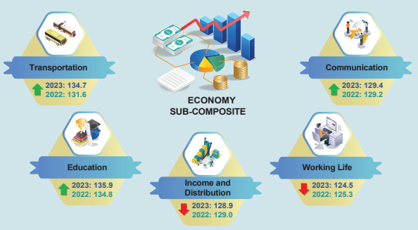 The analysis showed that three components recorded an increase in the sub-composite of economic well-being which comprises transportation (2.4%), education (0.8%) and communication (0.2%). Meanwhile, the working life component decreased by 0.6 per cent and followed by income and distribution (-0.1%).
