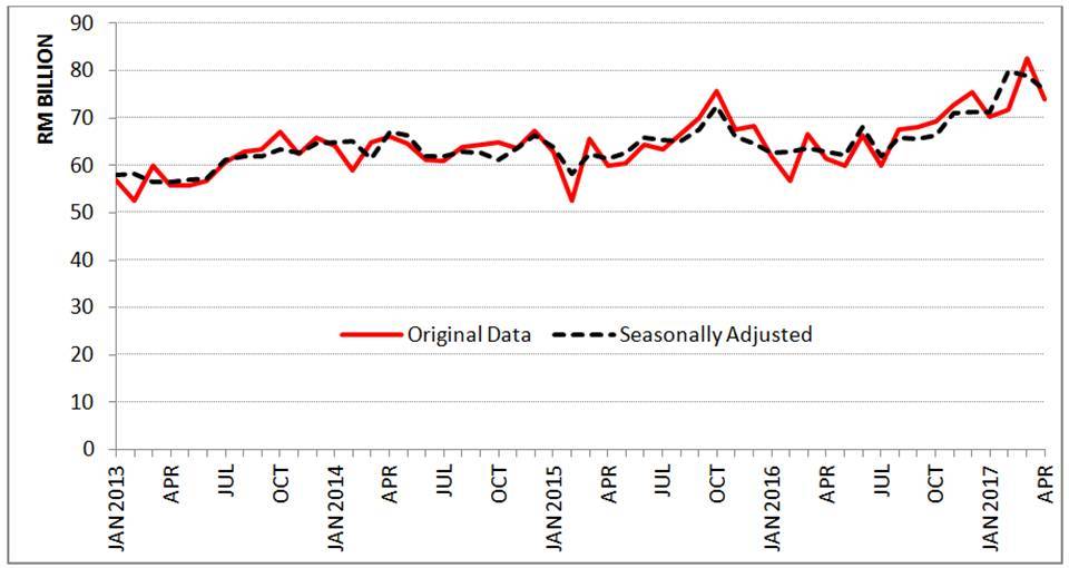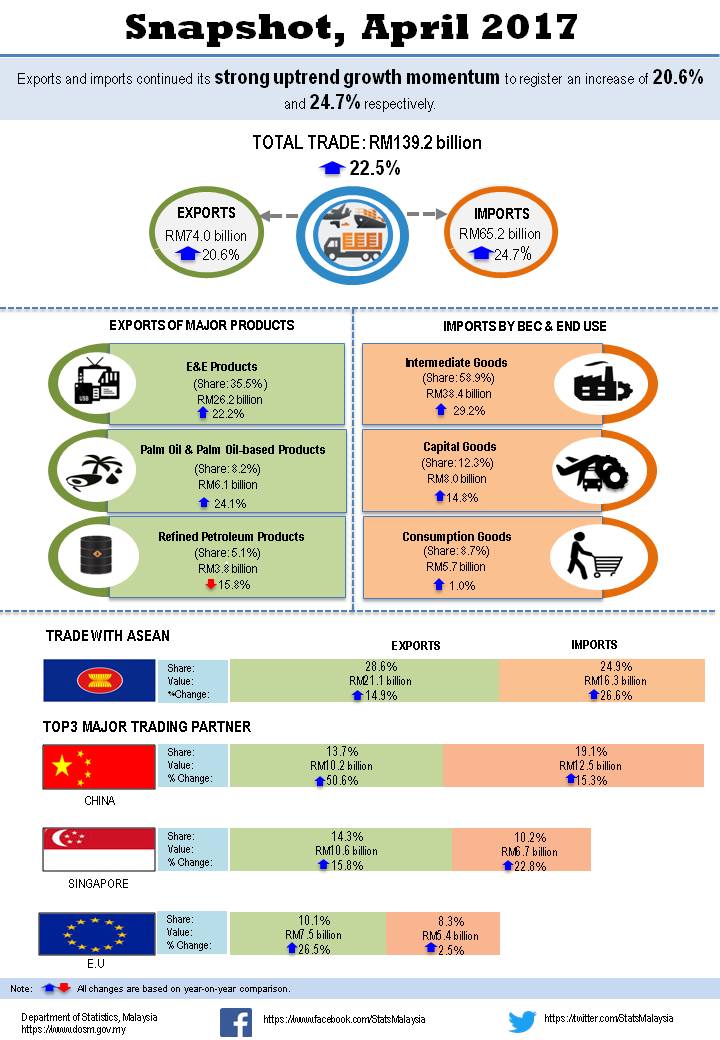 - On a year-on-year (y-o-y) basis, exports continued its strong uptrend growth momentum to register an increase of RM12.6 billion (+20.6%) to RM74.0 billion. Re-exports in April 2017 was valued at RM10.9 billion and accounted for 14.8% of total exports, while domestic exports growth by RM11.0 billion (+21.0%) to RM63.0 billion.