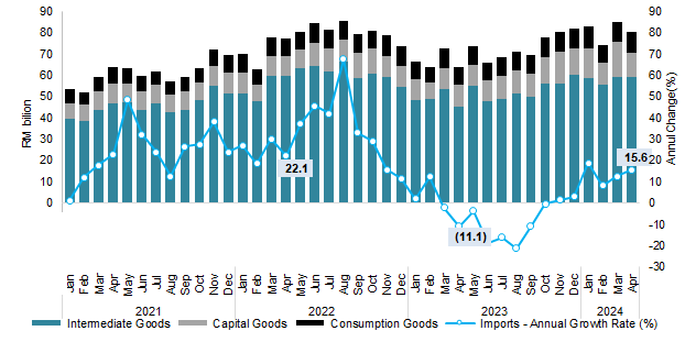 The value of Malaysia's imports in April 2024 continued to record an increase of 15.6 per cent or RM14.5 billion, reaching RM107.0 billion. On a month-to-month basis,imports declined 7.6 per cent or RM8.8 billion. Based on analysis of seasonally adjusted terms, month-on-month imports decreased 8.1 per cent to RM104.5 billion.