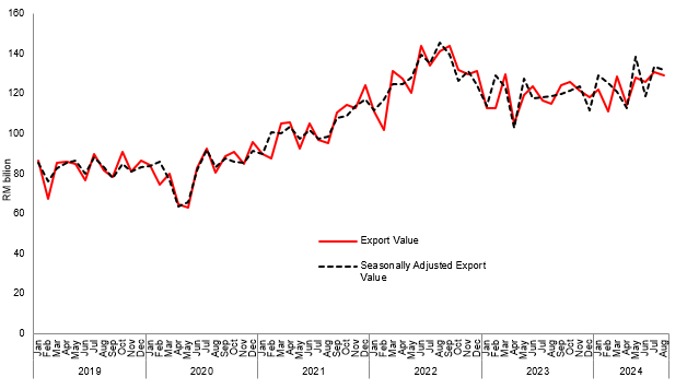 Chart 3 : Actual Export Value and Seasonally Adjusted Export Value, RM billion