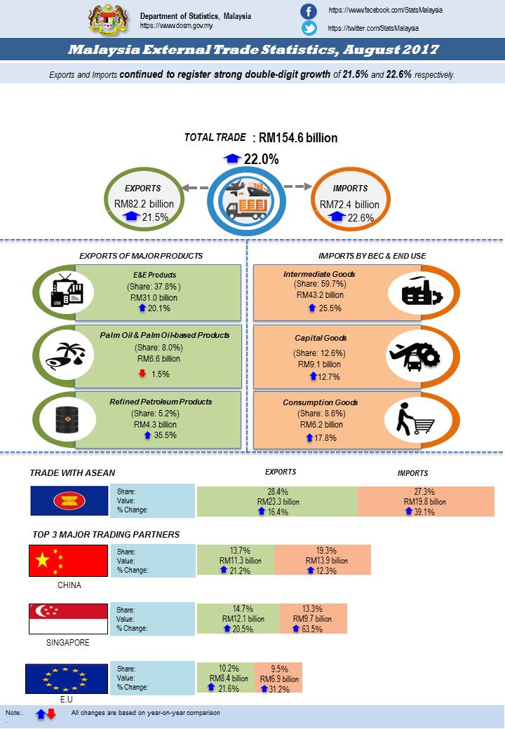 Total trade was valued at RM154.6 billion, an expansion of RM27.9 billion or 22.0% from a year ago. It also posted an increase of RM5.4 billion or 3.6% when compared to the previous month. A trade surplus of RM9.9 billion was recorded in August 2017, an increase of RM1.2 billion (+14.4%) from RM8.6 billion registered a year ago. When compared to the previous month, it also posted a growth of RM1.8 billion or 22.8%.