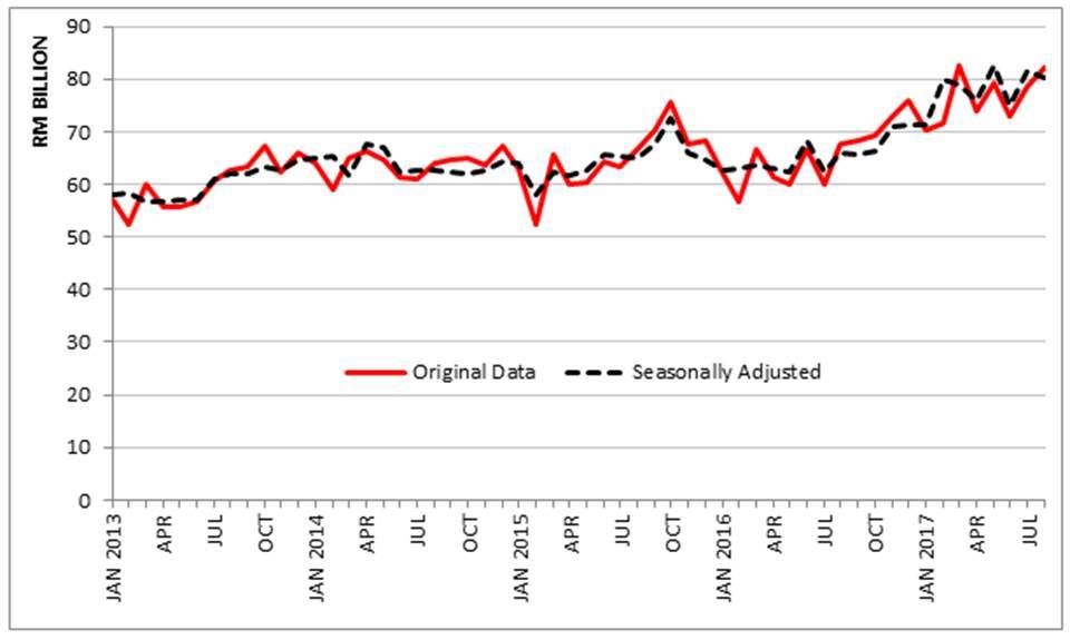On a m-o-m basis seasonally adjusted terms, exports decreased RM1.4 billion (-1.7%) to RM80.2 billion.