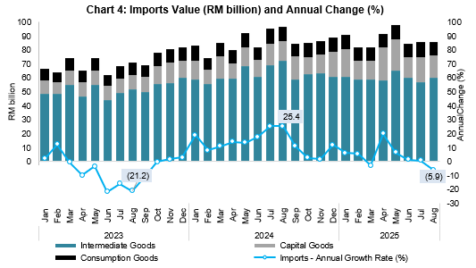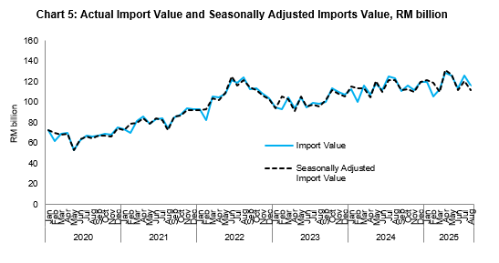 Malaysia's import value declined by 5.9 per cent or RM7.3 billion to RM115.5 billion in August 2025. On a monthly basis, imports registered a decrease of 8.0 per cent or RM10.0 billion. Based on seasonally adjusted month-on-month terms, imports recorded a decrease of 7.5 per cent to RM111.7 billion.