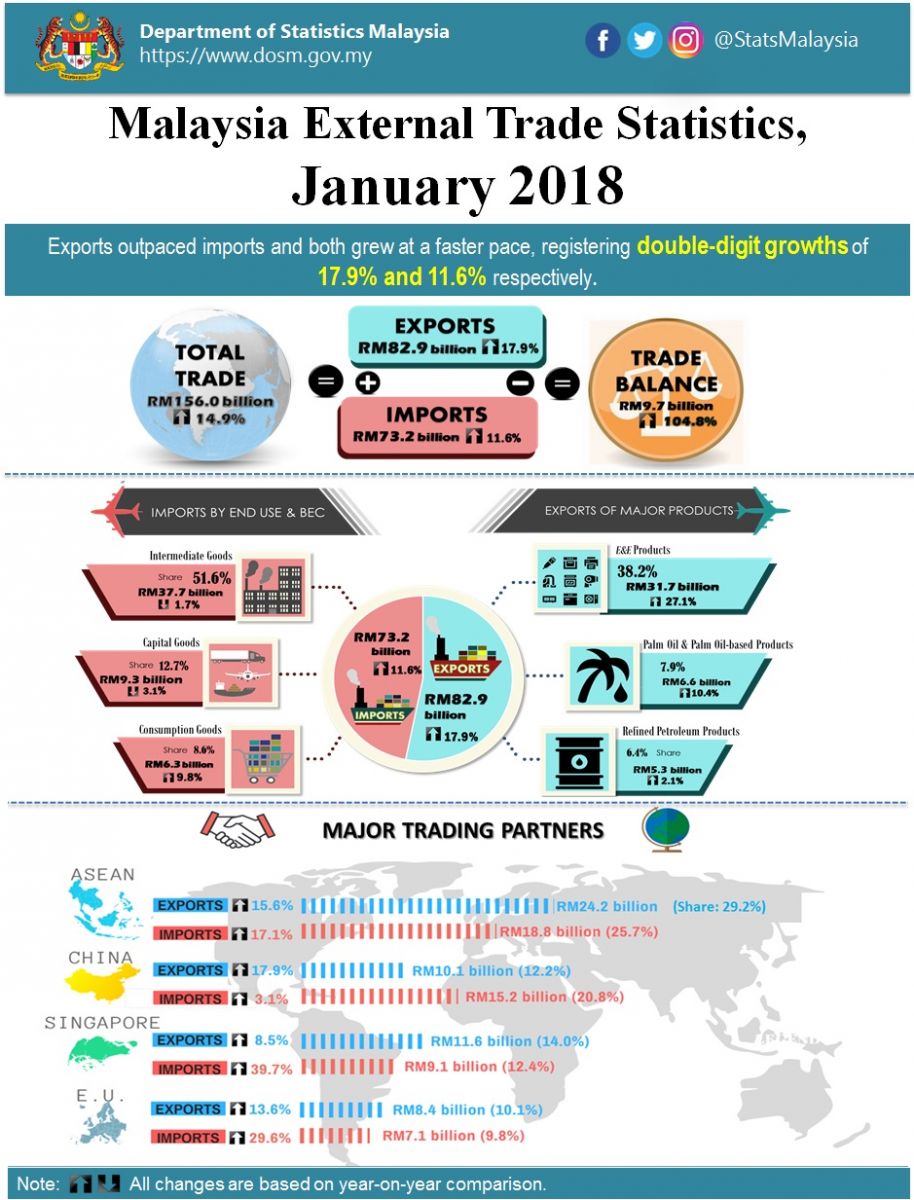 Total trade was valued at RM156.0 billion, an expansion of RM20.2 billion or 14.9% from a year ago. It also posted an increase of RM4.6 billion or 3.0% when compared to the previous month. A trade surplus of RM9.7 billion was recorded in January 2018, rising RM5.0 billion (+104.8%) from RM4.7 billion registered a year ago. When compared to the previous month, it expanded RM2.5 billion or 33.9%.