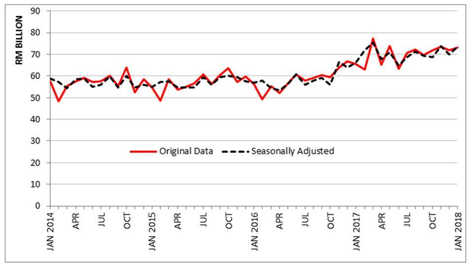 - On a m-o-m basis, imports also rose RM1.1 billion (+1.5%) from RM72.1 billion. In seasonally adjusted terms, imports increased 5.0%.