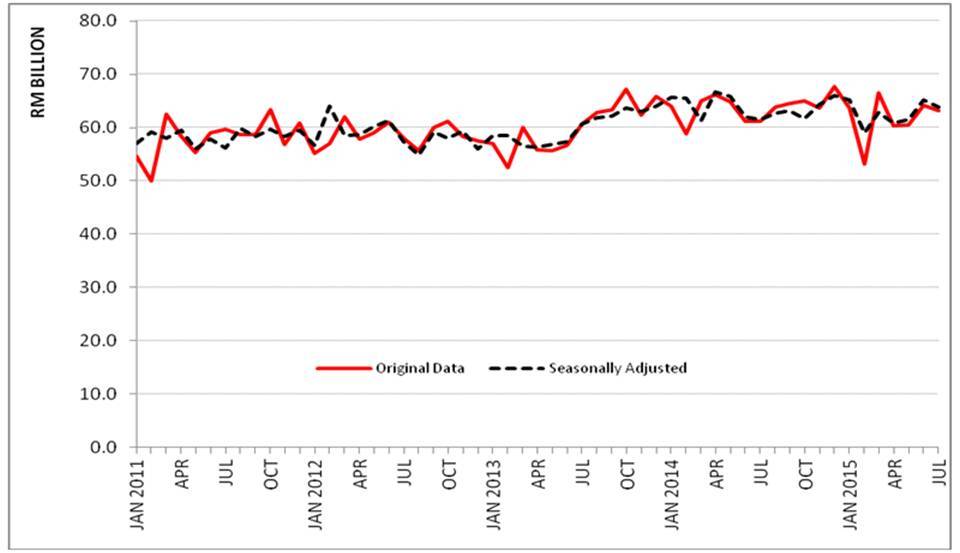 On a m-o-m basis seasonally adjusted terms, exports registered a decline of RM1.5 billion (-2.3%) to RM63.8 billion.