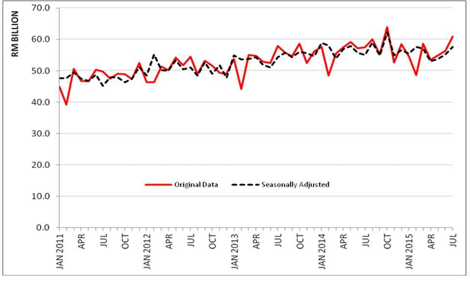 On a m-o-m basis seasonally adjusted terms, imports increased RM2.5 billion (+4.5%) to RM57.7 billion.