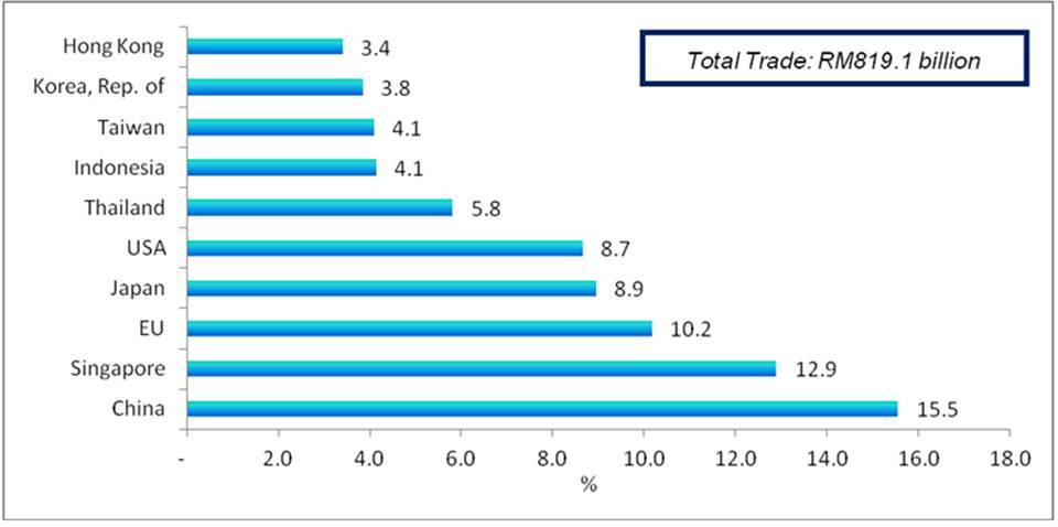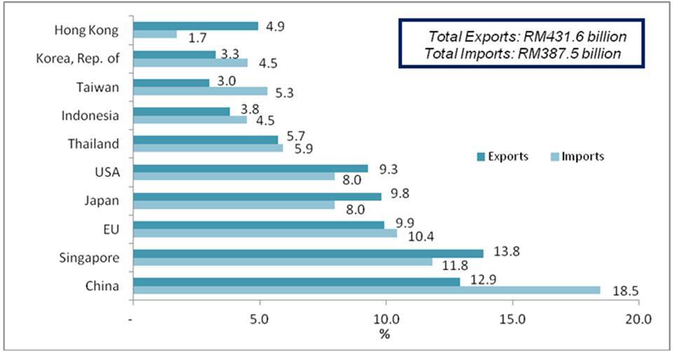 The following charts show Malaysia's major trading partners for January - July 2015.