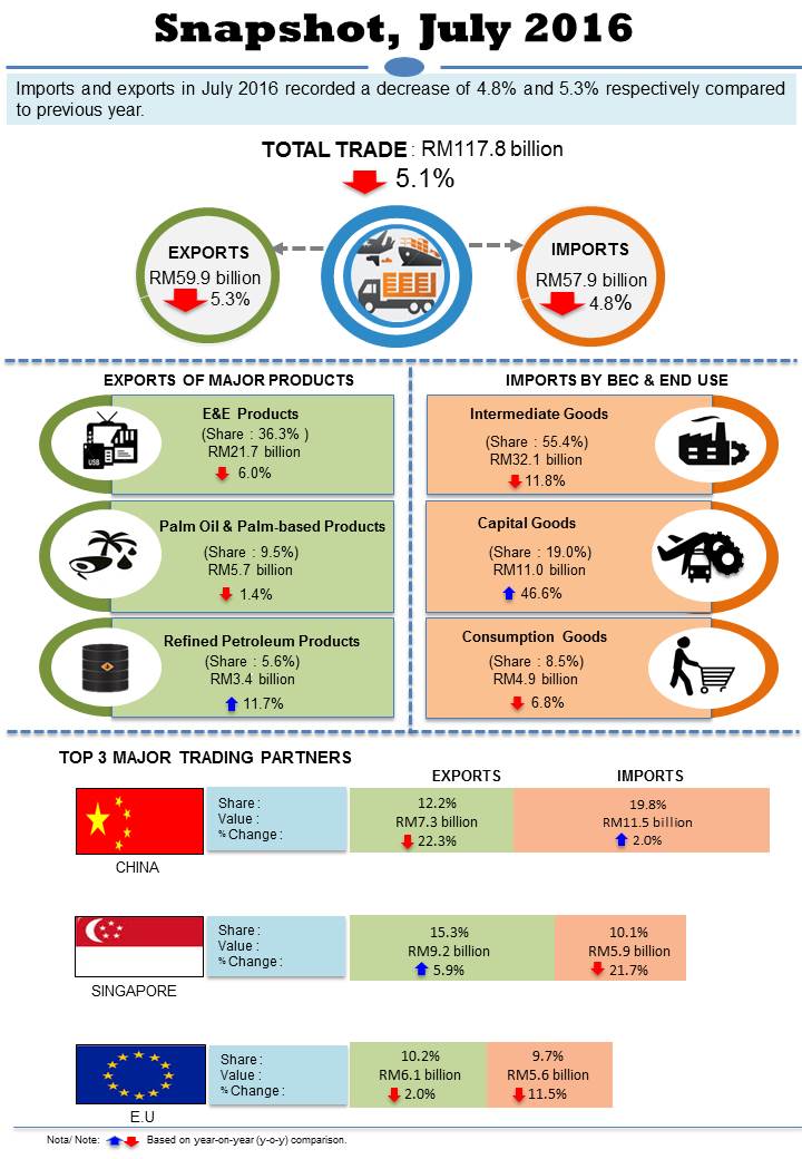 Total trade in July 2016, which was valued at RM117.8 billion, decreased RM6.3 billion (-5.1%) from a year ago. It posted a decline of RM9.6 billion or 7.5% from the previous month. A trade surplus of RM1.9 billion was recorded in July 2016, a decrease of 19.4% from RM2.4 billion registered a year ago. It also posted a decrease of RM3.6 billion or 65.4% when compared with the previous month.