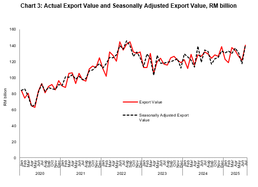 Malaysia’s exports surged by 6.8 per cent in July 2025, rising from RM131.5 billion in July 2024 to RM140.4 billion.