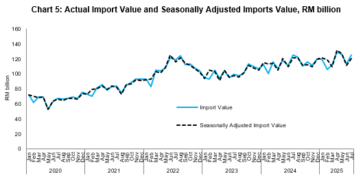 Malaysia’s import value rose by 0.6 per cent or RM753.5 million to RM125.5 billion in July 2025. However, on a month-on-month basis, imports surged by 10.9 per cent or RM12.3 billion. Based on seasonally adjusted month-on-month terms, imports recorded an increase of 8.6 per cent to RM120.7 billion.