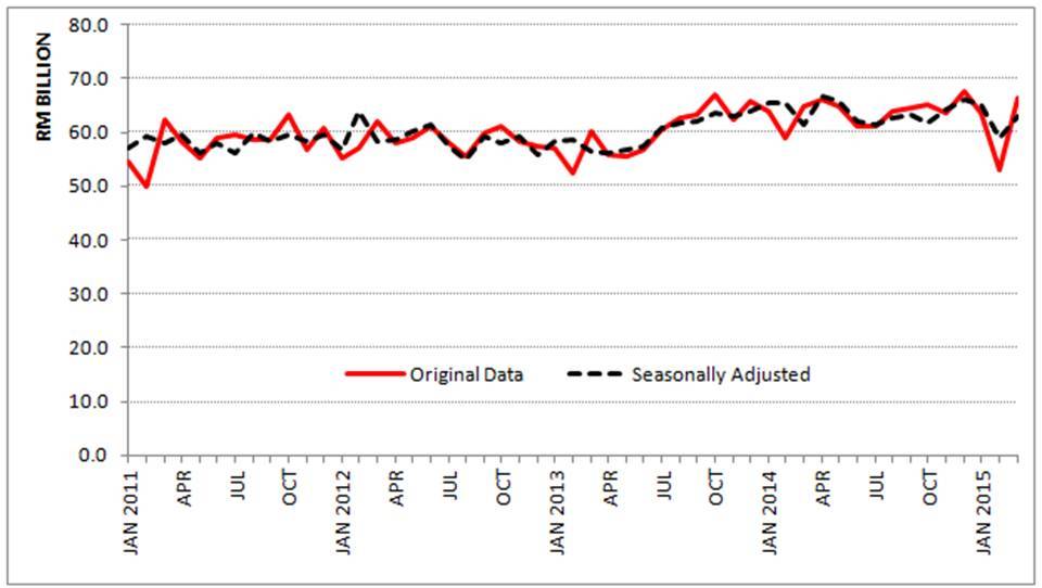 On a m-o-m basis seasonally adjusted terms, imports fell RM493.6 million (-0.9%) to RM57.1 billion.