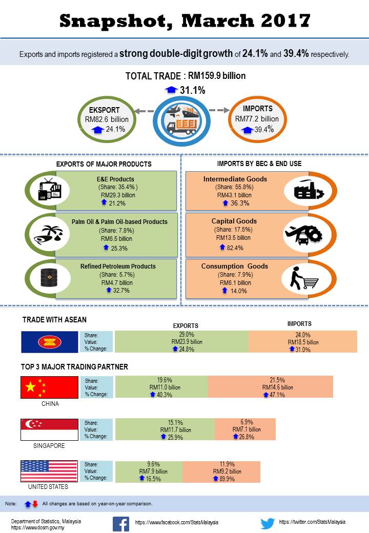 - On a year-on-year (y-o-y) basis, exports continued to register a strong growth with increase of RM16.0 billion (+24.1%) to RM82.6 billion. Re-exports in March 2017 was valued at RM12.4 billion and accounted for 15.0% of total exports.