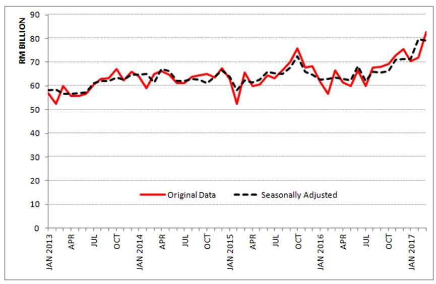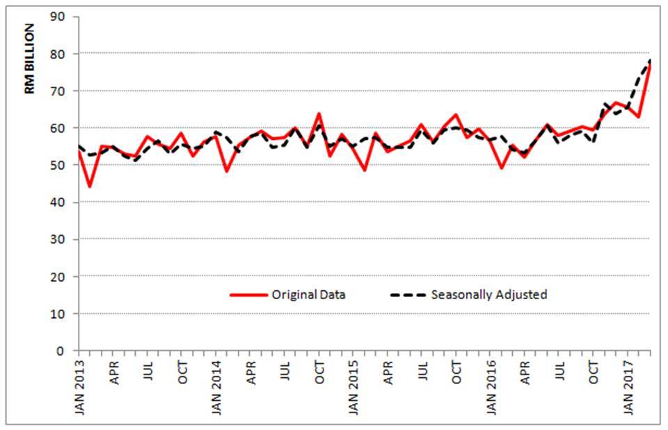 On a m-o-m basis seasonally adjusted terms, imports increased RM5.0 billion (+6.8%) to RM78.3 billion.