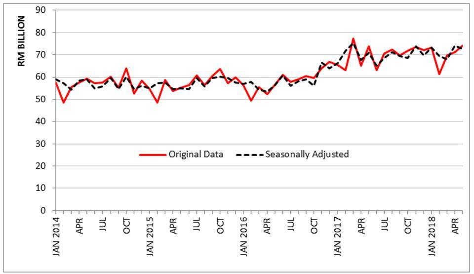 - On a m-o-m basis, imports posted a growth of 3.9% or RM2.8 billion from RM71.2 billion. However, in seasonally adjusted terms, imports decreased 1.7%.