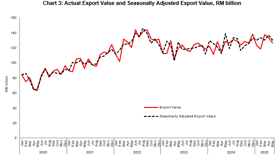 Malaysia’s exports decreased by 1.1 per cent in May 2025, down from RM128.0 billion in April 2024 to RM126.6 billion.
