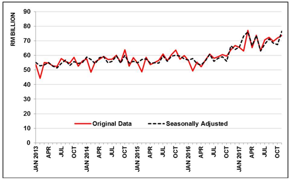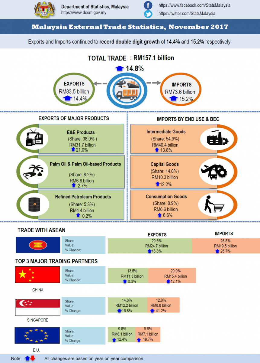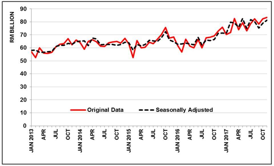 - On a year-on-year (y-o-y) basis, exports continued to register an increase of RM10.5 billion (+14.4%) to RM83.5 billion. Re-exports in November 2017 was valued at RM12.9 billion and accounted for 15.4% of total exports. Domestic exports grew 15.4% (+RM9.4 billion) to RM70.6 billion.