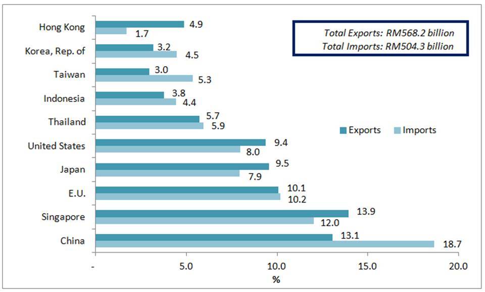 - On a y-o-y basis, the rise in exports were mainly to European Union (+RM1.4 billion), China (+RM1.0 billion), United States of America (+RM933.5 million), Singapore (+RM923.5 million) and The Philippines (+RM618.0 million).