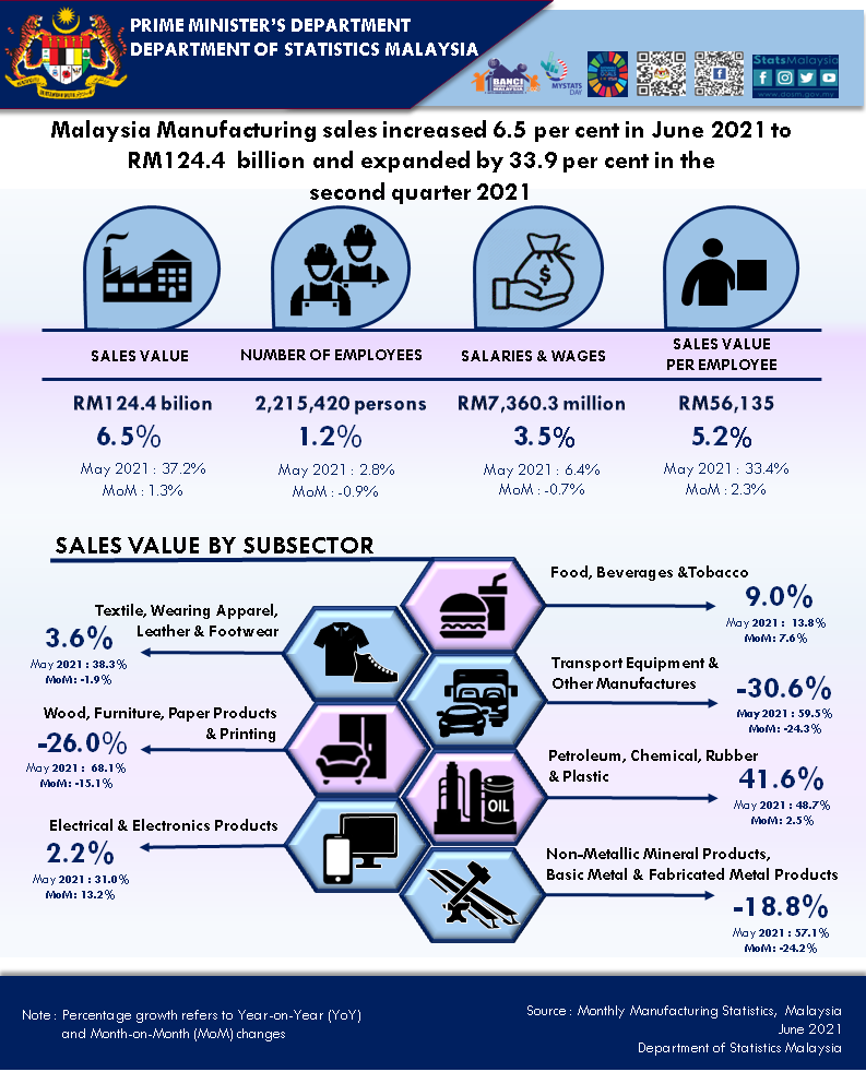 Malaysia Manufacturing sales increased 6.5 per cent in June 2021 to