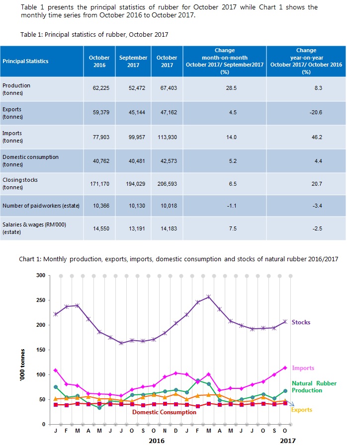 Production of natural rubber (NR) increased by 14,931 tonnes (28.5%) to 67,403 tonnes in October 2017 as compared to the previous month. Year-on-year comparisons also showed an increase of 8.3 per cent compared to October 2016. The main contributor of NR production is from smallholding sector which is more than 90 per cent.