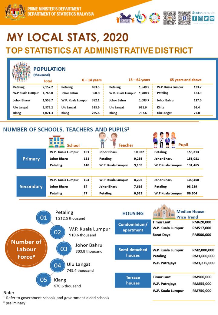 Findings in the education field showed that there were 10,220 schools in 2020 that is 7,780 primary schools and 2,440 secondary schools. Johor Bahru district recorded the most teachers with 10,052 persons (primary schools) and W.P. Kuala Lumpur (8,202 persons) for secondary schools. Meanwhile, the largest number of pupils were in Petaling district (153,313 persons) for primary schools and Johor Bahru (100,458 persons) for secondary schools.