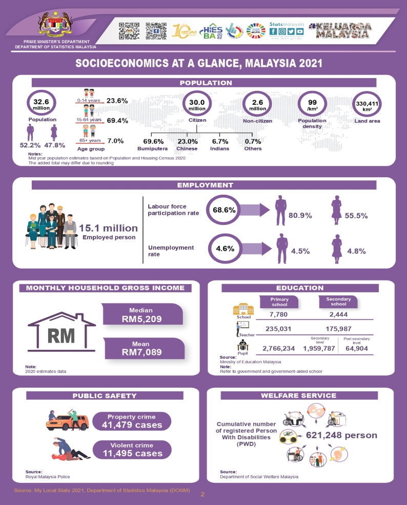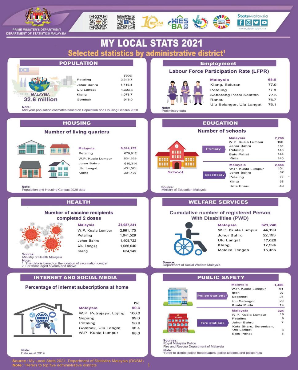 My Local Stats 2021, the fifth series of publications since 2017 comprises 173 publications namely one Malaysia publication, 13 states’ publications, three Federal Territories’ publications, and 156 publications by administrative district. The statistics are presented at the administrative district level which is much needed for inclusive national development planning.