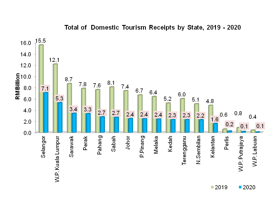 Overall, domestic tourism performance in Malaysia for 2020 declined significantly in visitor arrivals and total expenditure with -44.9 per cent and -60.8 per cent, respectively. Performance for all states contracted in terms of volume and value due to the implementation of the COVID-19 lockdown. In 2020, Selangor’s domestic visitor expenditure receipt was RM7.1 billion, a decline of -52.8 per cent from the previous year. W.P. Kuala Lumpur recorded RM5.3 billion, decreased -57.8 per cent. Also registered a significant decline was Sarawak which fell -61.0 per cent to RM3.4 billion. Other states that recorded notable decline were Perak -61.5 per cent (RM3.3 billion) and Pahang -64.1 per cent (RM2.7 billion).