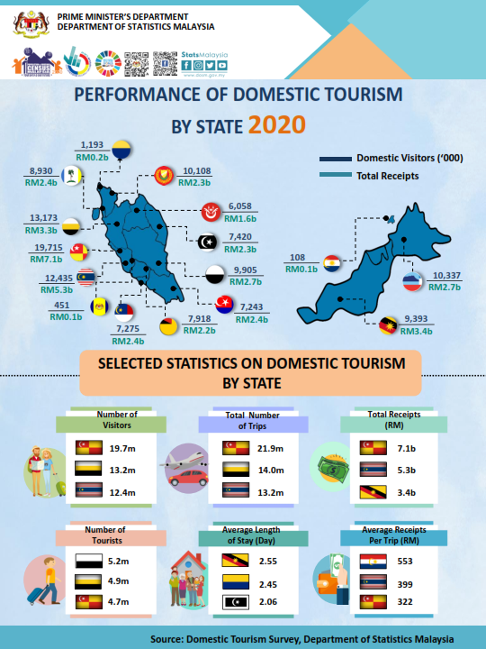 This report is published to provide statistics on domestic tourism at state level.The statistics reported are based on the Domestic Tourism Survey conducted in 2020. Amongst the key statistics included in this report are the number of visitors, total receipts, number of trips and average length of stay. Besides, the report also presents statistics on travelling patterns such as main destinations visited, mode of transport and type of accommodation. In addition, statistics on social & demographic profiles of domestic visitors by age group, ethnic group, educational level, household income class and employment status are also displayed in the publication.