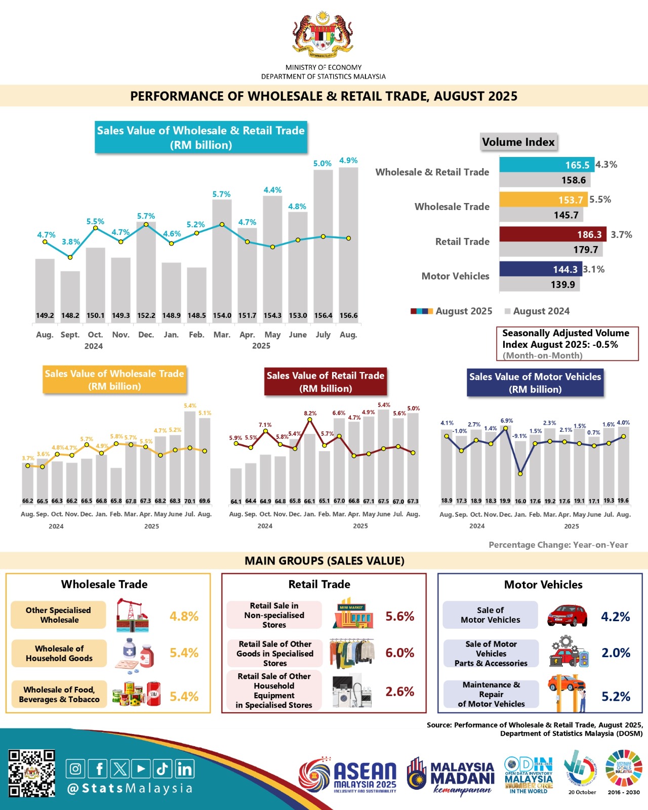 Sales value of Wholesale & retail trade recorded RM156.6 billion in August 2025, grew 4.9 per cent year-on-year. The positive growth was contributed by all sub-sectors, namely Wholesale trade 5.1 per cent, Retail trade 5.0 per cent, and Motor vehicles 4.0 per cent. Meanwhile, for month-on-month comparison, sales value inched up by 0.1 per cent.