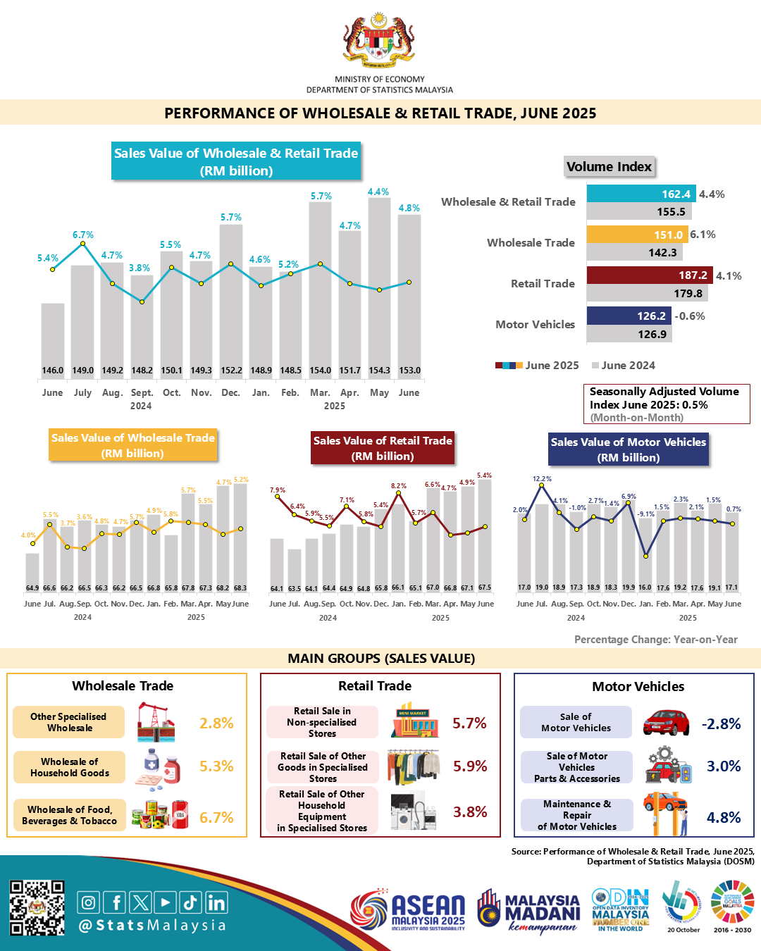 Wholesale & retail trade recorded RM153.0 billion in June 2025, grew
