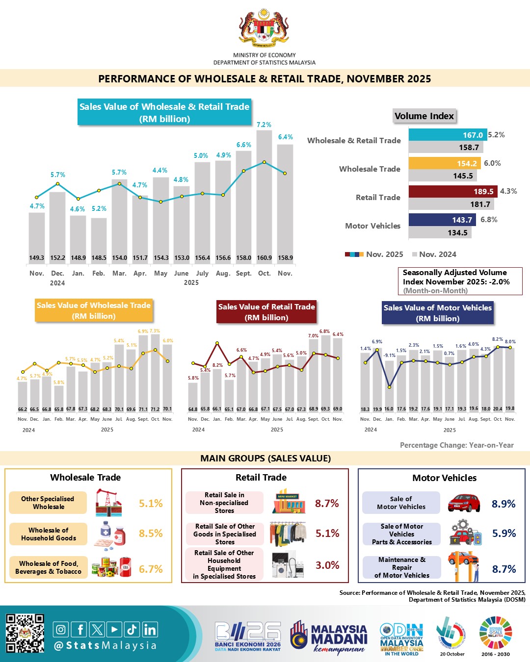 Sales value of Wholesale & retail trade recorded RM158.9 billion in November 2025, grew 6.4 per cent year-on-year. The positive growth was contributed by all sub-sectors, namely Motor vehicles 8.0 per cent, Retail trade 6.4 per cent, and Wholesale trade 6.0 per cent. Meanwhile, for month-on-month comparison, sales value decreased -1.2 per cent.