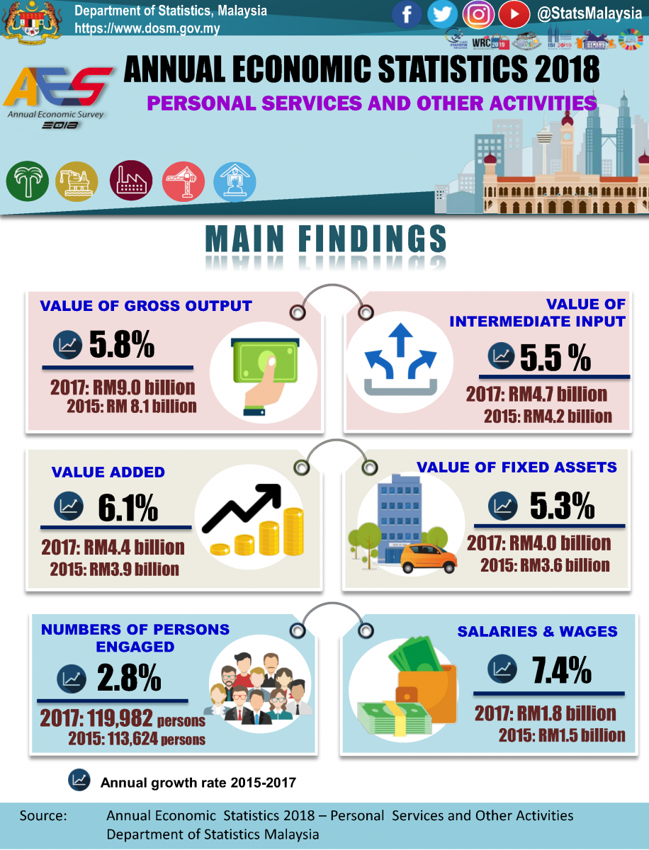 The Personal services and other activities recorded gross output value of RM9.0 billion in 2017 compared to RM8.1 billion in 2015 with the annual growth rate of 5.8 per cent. In line with the growth in gross output, the value of intermediate input increased by RM0.5 billion to record RM4.7 billion with the annual growth rate of 5.5 per cent, Thus resulting a value added of RM4.4 billion for the year 2017.