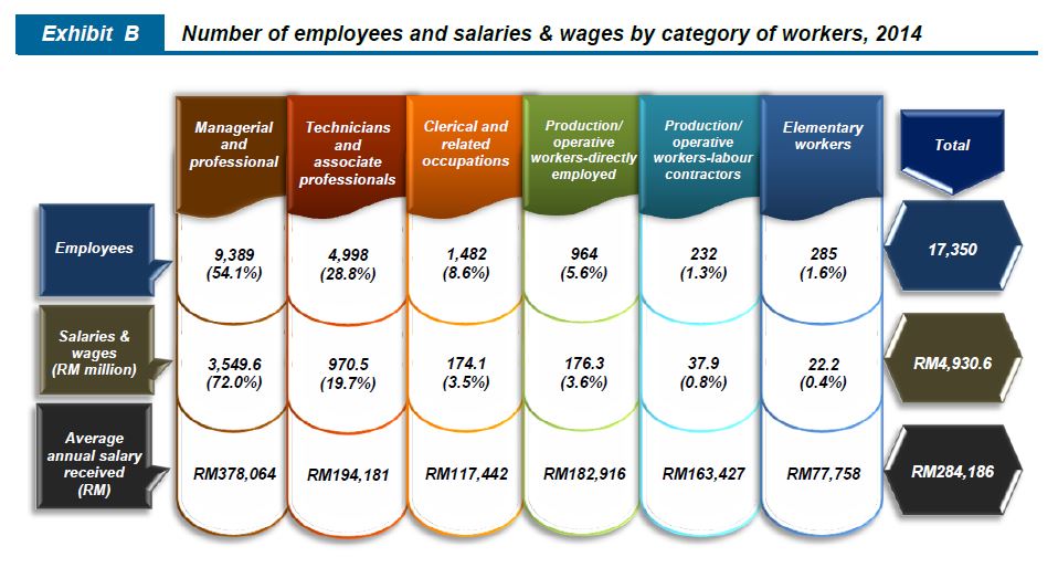 The managerial and professional category recorded the highest average annual salary with RM378,064 followed by technicians and associate professionals (RM194,181) and production/operative workers directly employed (RM182,916).